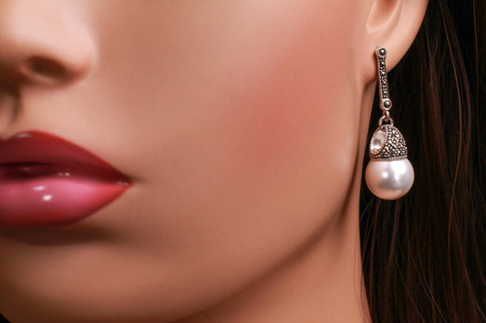 Vintage Marcasite with Pearl 14mm 925 Sterling Silver Dangling Post Earring. Vintage antique gift for her. 925 Stamped