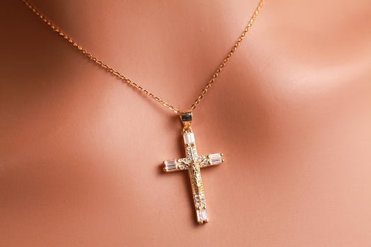 18k Gold Vermeil and 925 Sterling Silver CZ Diamonnd baguette setting Cross Pendant Necklace 925 stamped