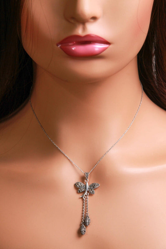 Marcasite 925 Sterling Butterfly Pendant 23mm with 2 Oval marcasite charm dangling Rhodium Sterling Silver Chain, Vintage antique gift