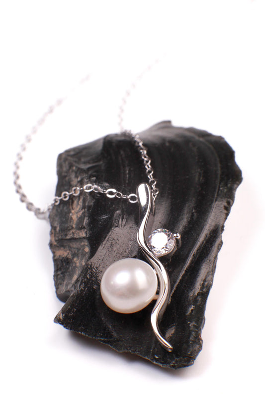 Marcasite 925 Sterling CZ Diamond with 10mm Freshwater Pearl Pendant Necklace with Rhodium Non Tarnish Sterling Silver Chain, Vintage gift