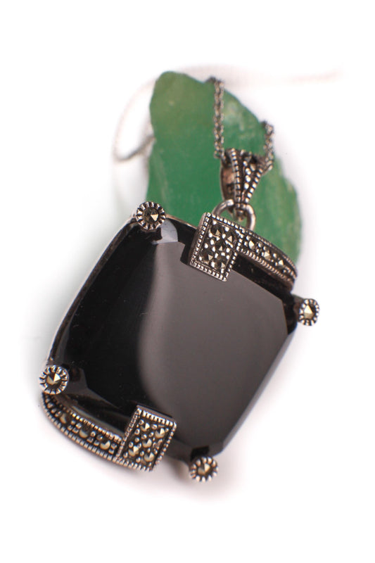 Vintage Marcasite and Black Onyx 925 Sterling Silver 22mm Square Pendant Necklace 925 Sterling Silver Chain, Vintage, Antique gift