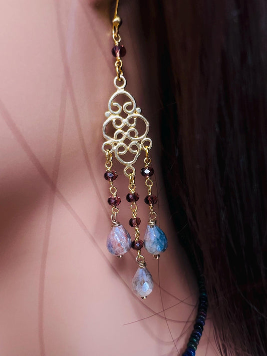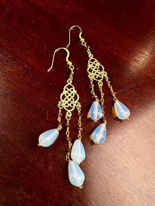 Genuine Garnet and opalite drop Gold vermeil chandelier earrings