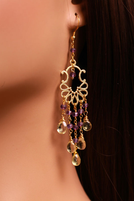 Natural Lemon Quartz Dangling Wire Wrapped Amethyst Chandelier in 14K Gold Vermeil Ear wire, 925 Stamped, Precious Gift for her