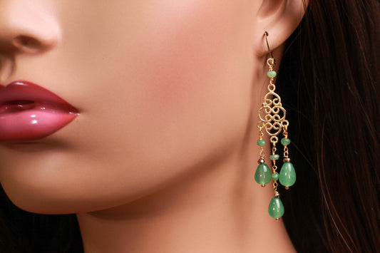 Natural Green Aventurine Chandelier gold vermeil Earrings handmade beautiful gift