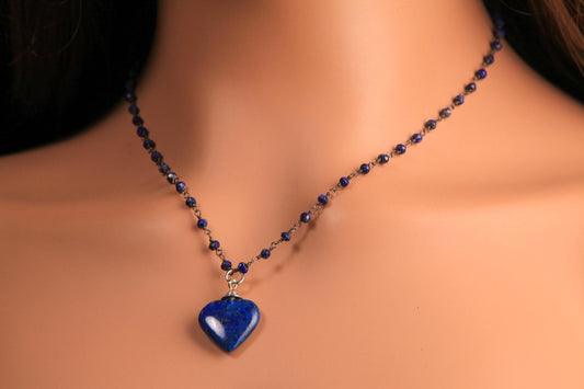 Natural Lapis Lazuli 3mm Faceted Chain, Dangling 21mm lapis Lazuli heart black oxidized Elegant simple Necklace, gift