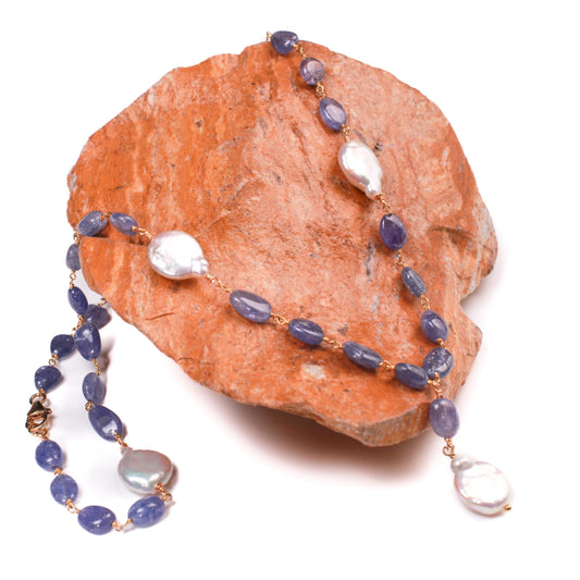 Natural Tanzanite 7-8.5mm smooth oval freshwater Coin pearl spacer and dangling pendat 18k Gold Vermeil handmade Necklace.