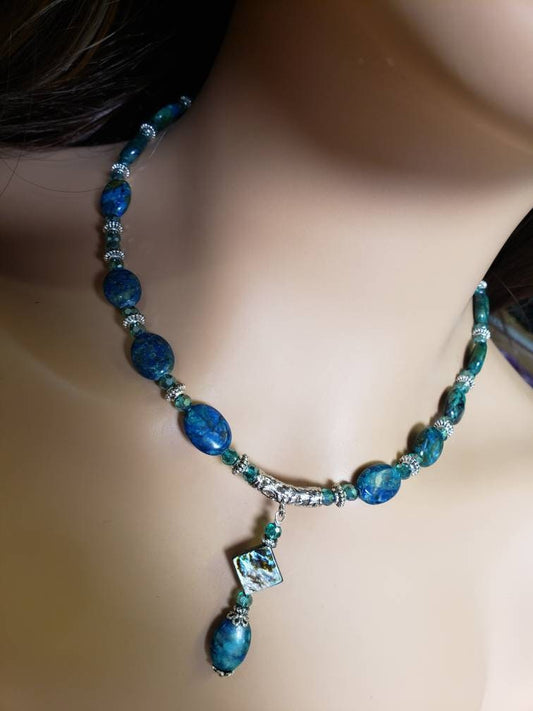 Azurite & Abalone Shell Pendant Necklace, Rhodium Silver, Bali Spacer