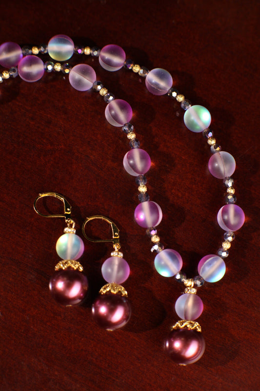 Matte Purple Sea Glass 10mm, South Sea Seashell Pearl, Matching Earrings Jewelry Set.14mm Pearl Centerpiece Necklace with 2" Extension Chain