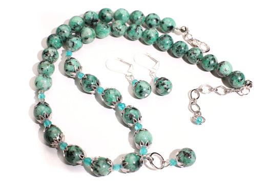Aqua Tera Green Jasper 10mm Round Pendant Necklace with Apatite Spacers, Matching Earrings Jewelry Set 18" plus 2" Extension