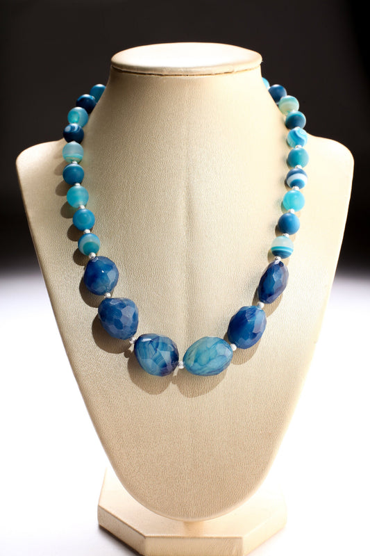 Blue Stripe Banded Agate Free Form Faceted Pebble Nugget Centerpiece Necklace, Matte Banded Blue Agate with Brushed Silver Spacers 18.5"