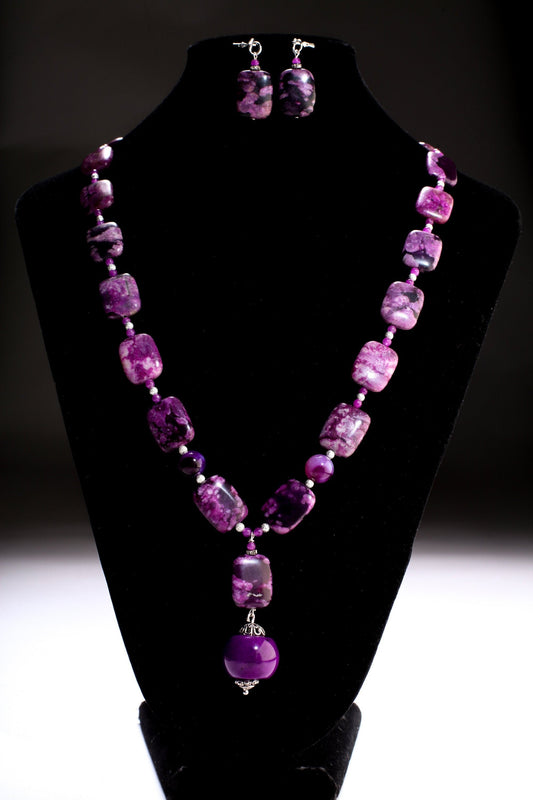 Lepidolite Necklace, Earrings Set, Pillow Shape Accents with Stardust Silver, Lepidolite Focal, Purple Agate Drum Pendant, Bali Style Clasp