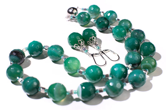 Natural Green agate ,stripe Agate Necklace Earrings Set,14mm Faceted Round with Matching Earrings 20" with ball Mag Clasp,