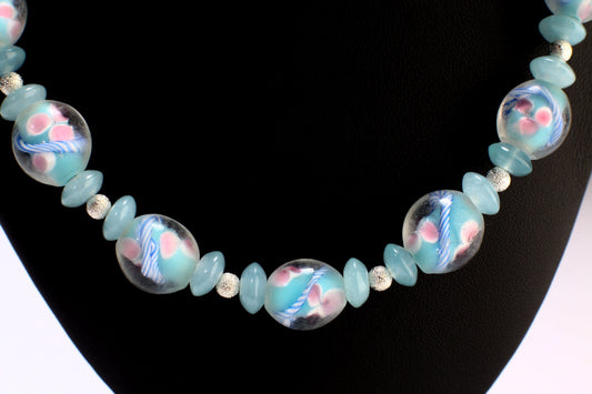 Czech Glass Pink Flowers Foil Lamp work 12x13mm Oval Beads with Blue Aquamarine Rondelle, Brushed Silver Spacer Beads 21" Necklace