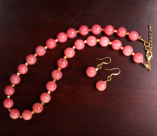 Pink Jade 12mm Round Necklace with Bali Style Gold Spacer Bead, Matching Pink Jade Earrings Jewelry Set.