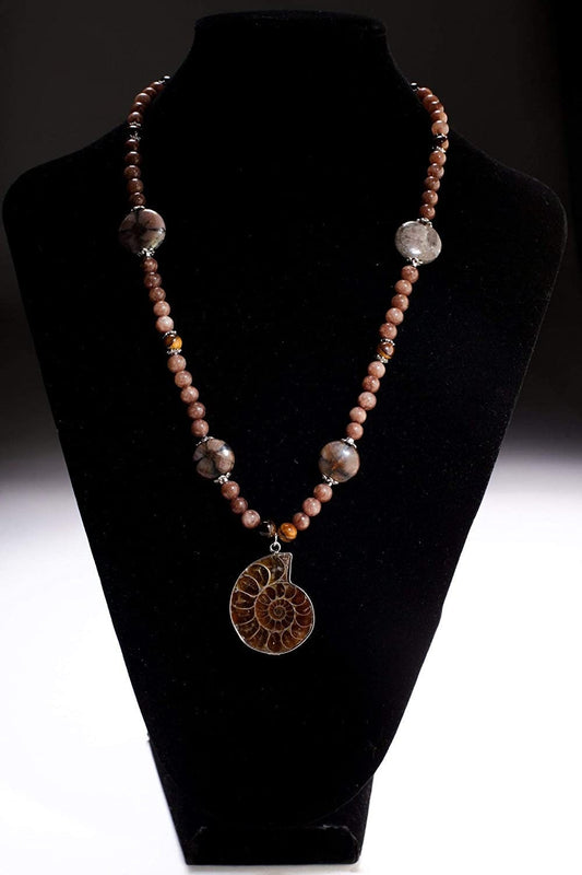 Ammonite Fossil Bezel Pendant Necklace Chiastolite Bead Spacers, Tiger Eye, Brown Jasper Round Bali Style Toggle Clasp 20" vintage Necklace