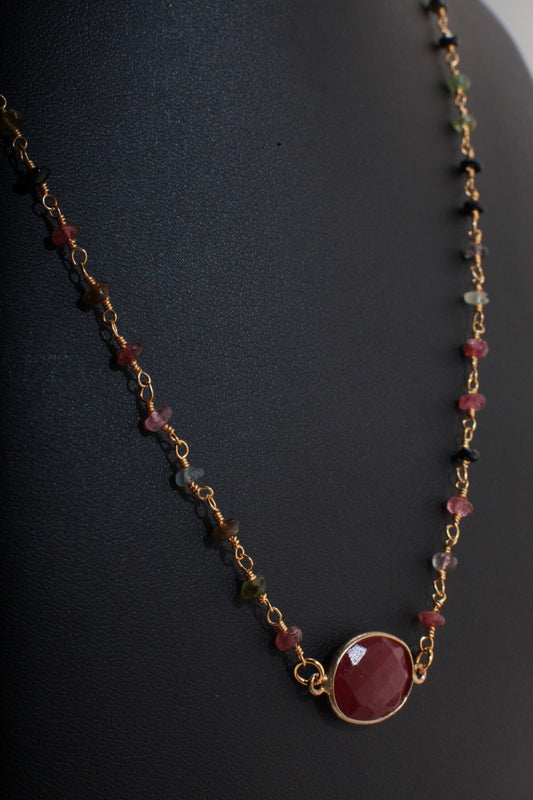 Genuine Ruby Faceted Free Form Oval Gold Vermeil Bezel with Stunning Tourmaline Beaded Rosary Chain 16" Necklace, Girlfriend Gift.