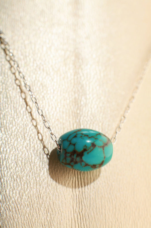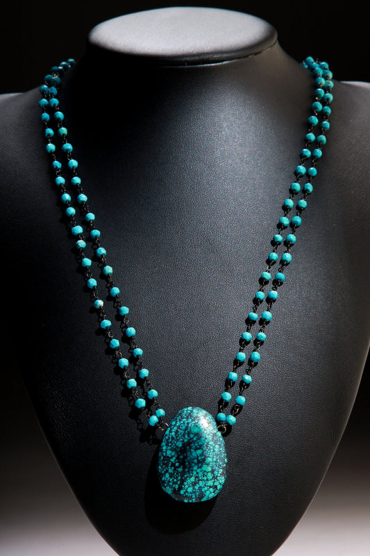 Natural Tibetan Spiderweb Turquoise Teardrop Pendant with Natural Turquoise Oxidized Silver Wire Wrap Double Layer 18+ 2" Extension Necklace