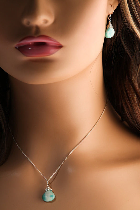 Natural Blue Opal Pear Drop Pendant, Sterling Wire Wrapped Earrings Jewelry Set, Blue Peruvian Opal 13x14mm Teardrop in 925 Sterling Silver