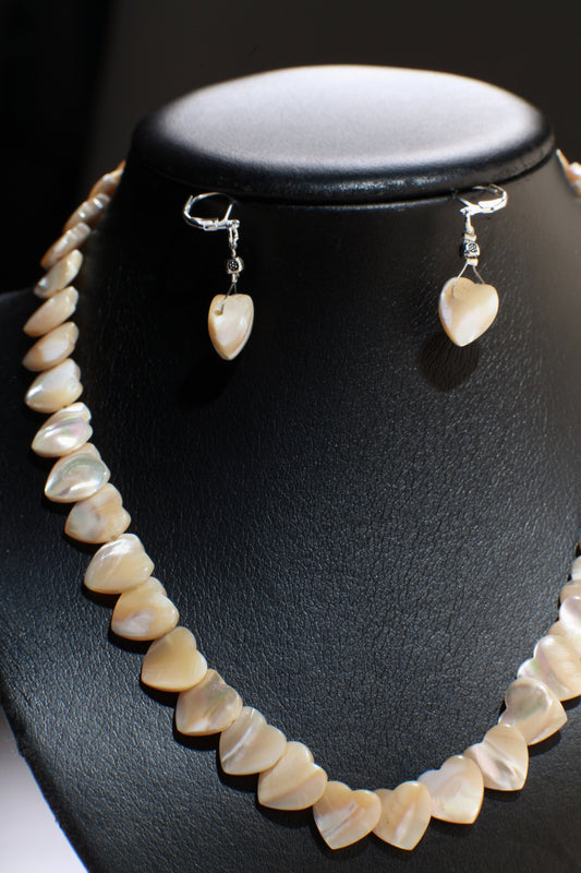 Mother of Pearl Heart Necklace, Earrings set, Natural MOP Mother of Pearl 13mm Puffed Overlap Heart Seashell Necklace Earrings Jewelry Set
