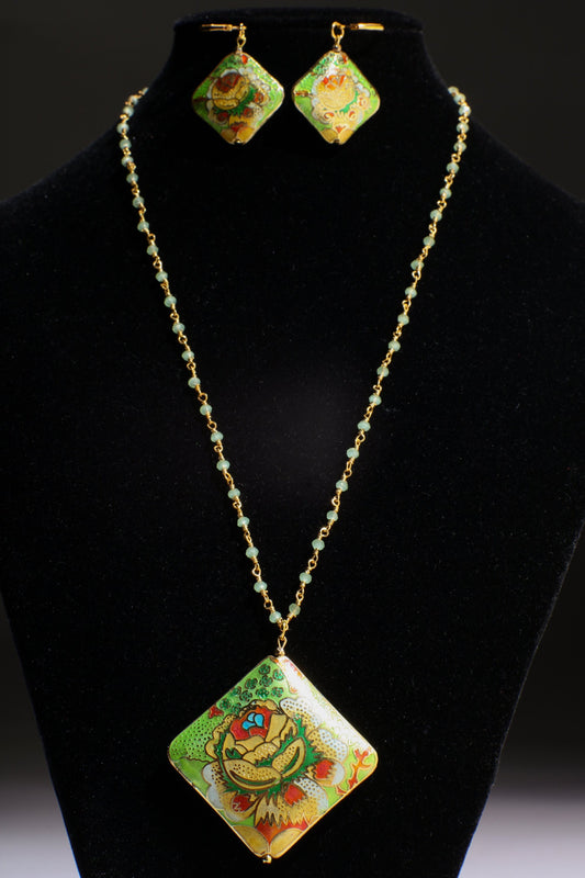 Traditional Cloisonné Pendant Vintage Floral Flowers Focal with Gold Plated Beaded Chain Necklace 20" and matching Leverback Earrings set
