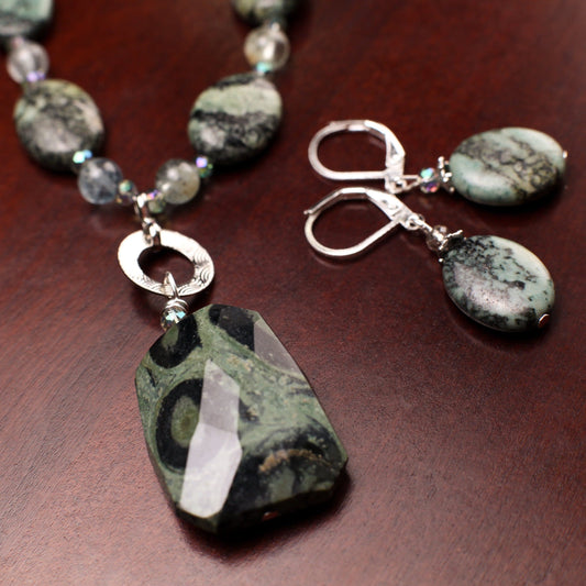 Natural Kambaba Jasper Twisted 22x30mm Pendant with African Turquoise 12x15mm Oval and Aquamarine Round Spacers 19" + 2" Extension Necklace