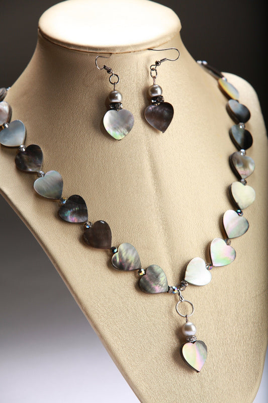 Natural Black Lip Mother of Pearl Heart Shaped 19" Necklace with 2.5" Extension paired with matching Healing Earrings set