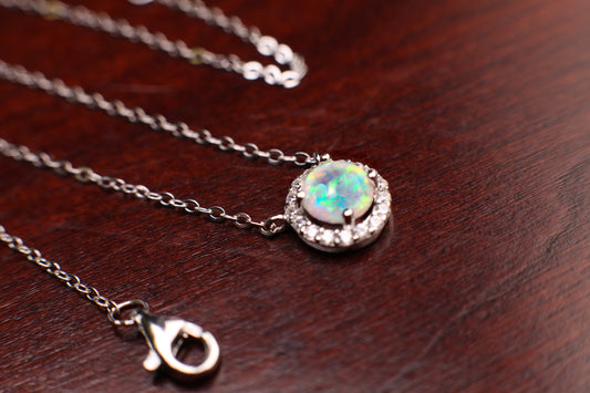 Ethiopian Fire Opal, Welo Opal, 9mm Round CZ Diamond setting pendant in 925 sterling silver Necklace. Genuine AAA Quality Fiery Opal gift
