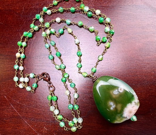 Flower Agate, Japanese blossom agate 2 line necklace 4mm faceted chain and large pendant 30x37mm handmade wire wrapped antique brass 18”