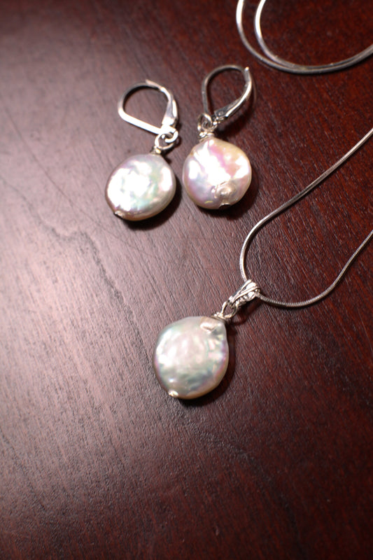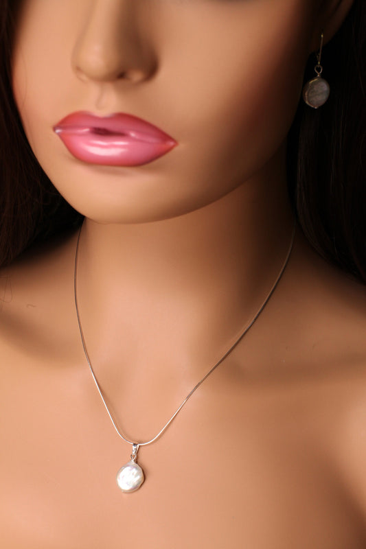 Natural Freshwater Coin Pearl White High Luster Dangling Pendant, Earrings Jewelry set in 925 Sterling Silver