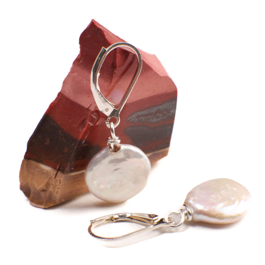 Dangling 12mm White Coin Pearl Earrings: Sterling Silver Leverback