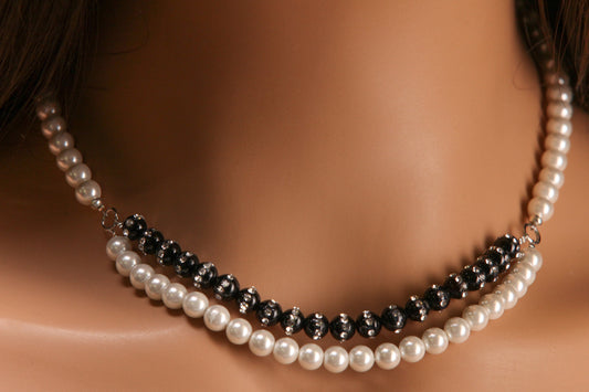 Genuine Black Onyx 6mm Rhinestone Inlaid, South Sea Seashell Pearl 6mm White double line front necklace. Elegant Gift for Her
