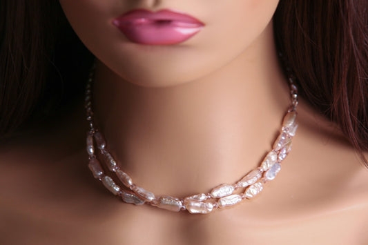 Natural Fresh Water Biwa Stick Pearl 6x13mm Double Line Necklace