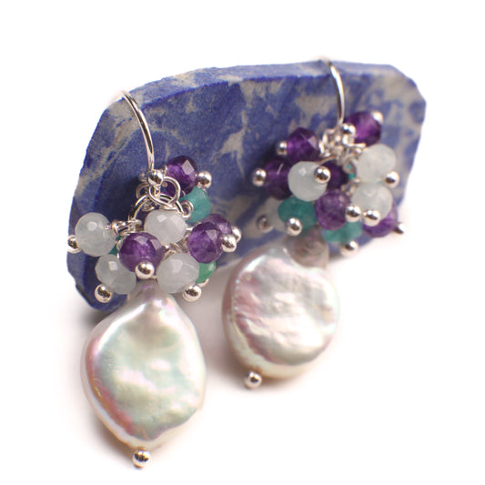 Freshwater Coin Pearl earring 12-13mm cluster with Apatite, Aquamarine, Amethyst wire wrapped 925 sterling silver earrings