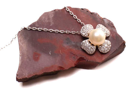 925 Sterling Silver CZ Diamond freshwater Pearl flower pendant with Sterling Silver Chain Necklace gift ,925 stamped 16” extend to 18”