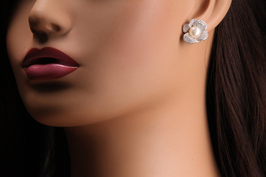 925 Sterling Silver CZ Diamond Freshwater Pearl Flower 18x19mm Post Earrings ,925 stamped Elegant Gift, Evening wear