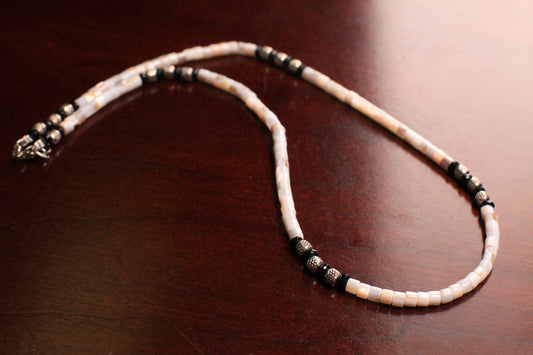 Natural Mother of Pearl Heishi Roundel 4mm black onyx Bali spacer ivory white Necklace for Man and Woman in Silver Lobster Clasp,Beach Boho