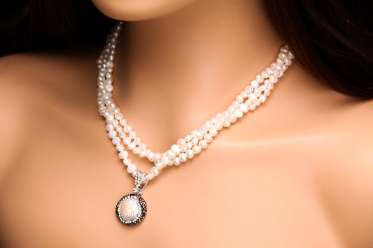 Natural Freshwater White Pearl High Luster Triple Strand Necklace, Freshwater 12mm Coin Pearl & Rhinestone Inlaid Pendant, 17"+2" Extender