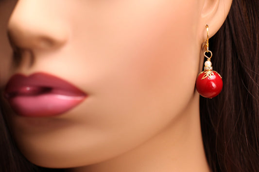 Dark Bright Red South Sea Shell Pearl 16mm Large High Luster, Freshwater Pearl Spacer, Gold Leaf Cap Rhinestone Leverback Earrings