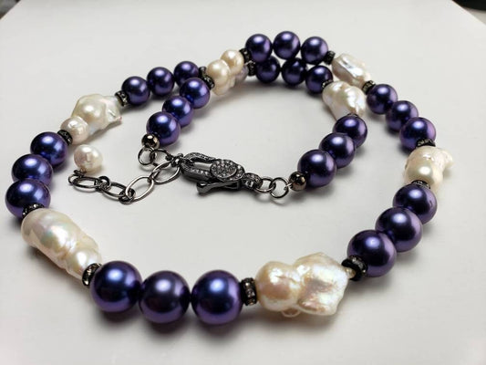 Blue South Sea shell pearl 8mm with Freshwater baroque pearl 20x27mm large, CZ diamond pave clasp Statement necklace, Gift 18"+ 3" Extender