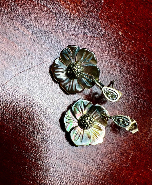 Natural Freshwater black lip Mother of pearl hand carved flower 14mm High Luster Dangling Earrings in 925 sterling silver .
