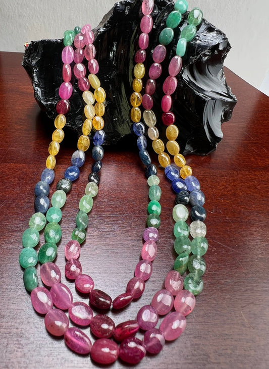 Genuine Multi Sapphire ruby emerald smooth oval 6.5-8.8mm Gemstones 3 Line Layer Adjustable thread Necklace 15"-17" necklace 339 cts