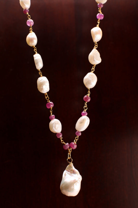 Genuine Freshwater Baroque Pearl, Ruby Faceted Rondelle Spacers, 25mm Baroque Pearl Pendant 14K Gold Filled Necklace