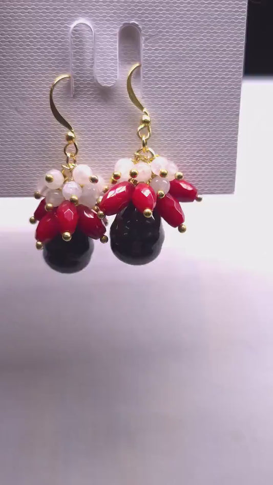 Moonstone and Bamboo Coral Dangling with Black south seashell Baroque Pearl Gold Earrings, Bridal, Boho, Handmade Gift for Her