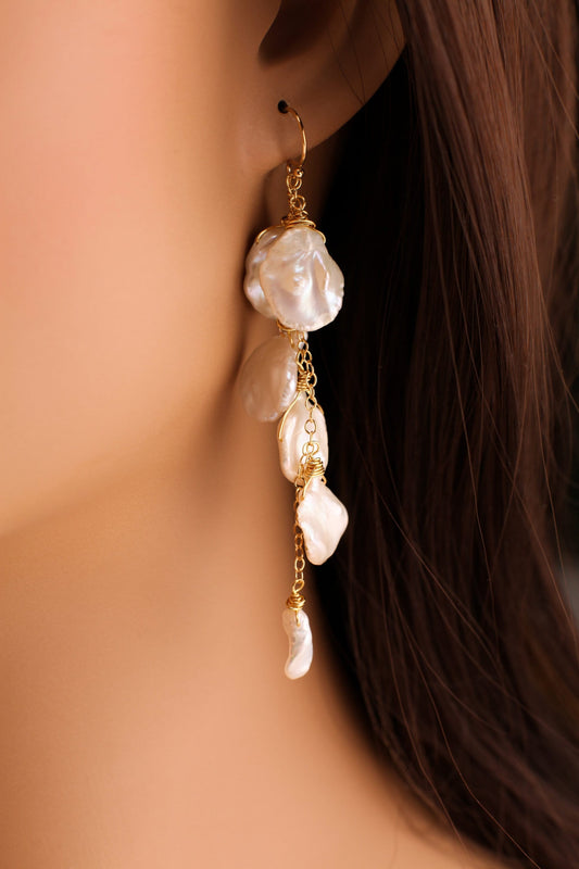 Genuine Freshwater AAA High Luster Keshi Pearl wire wrapped 14K Gold Filled Dangling Long Earrings, Bridal, Boho, Beachwear, Handmade Gift