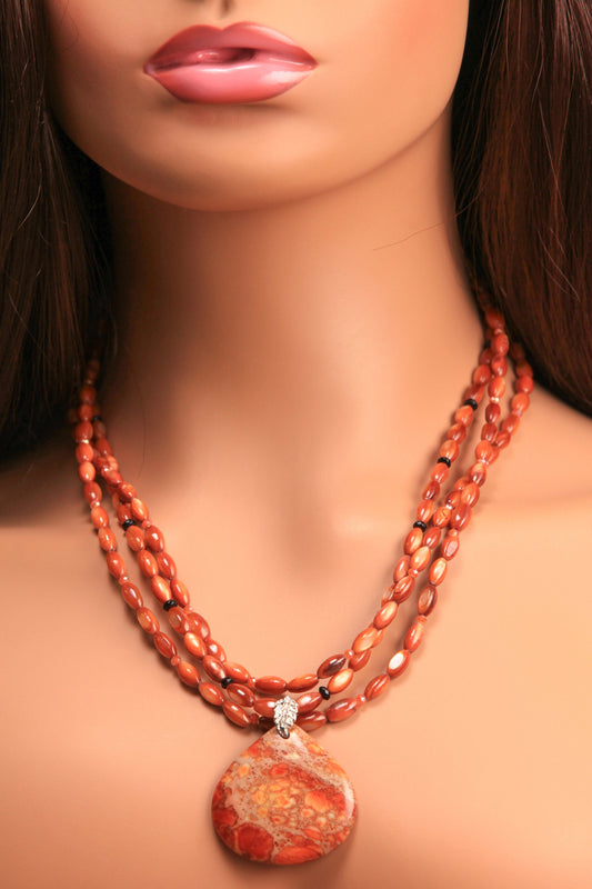 Natural Aqua Terra Jasper Large Teardrop Pendant with natural Mother of Pearl Rice Oval Black Onyx Spacers 3 Line Layer Adjustable Necklace.