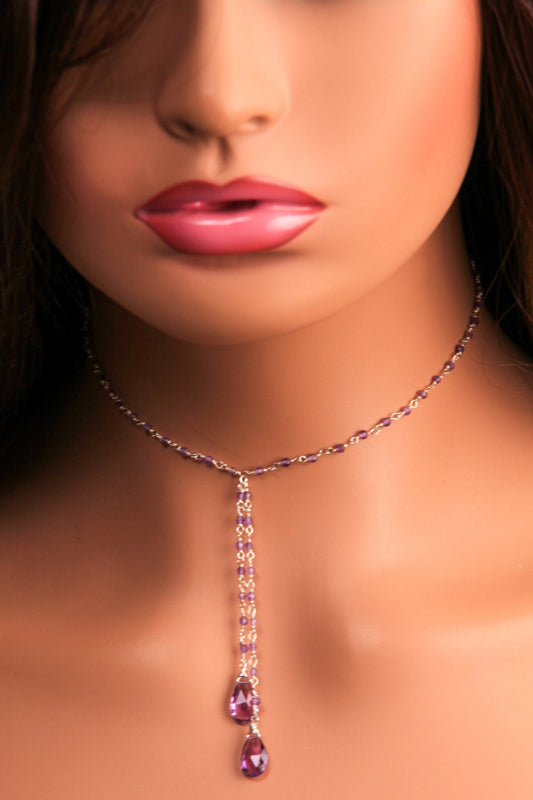 Natural Amethyst Faceted drop AAA quality dangling with Amerhyst beaded wire wrapped handmade Lariat necklace
