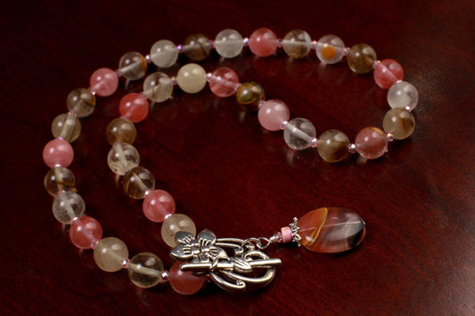 Fire Strawberry quartz 10mm round beaded necklace with pendant fancy silver flower toggle pink strawberry shaded necklace