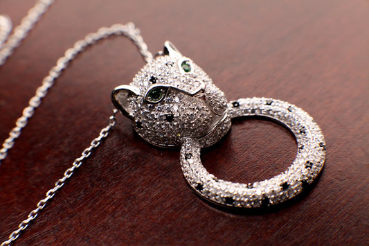 Cubic Zirconia Diamond 925 Sterling Silver Panther Jaguar with Ring Pendant Necklace. 16” plus 2” extension, 925 stamped