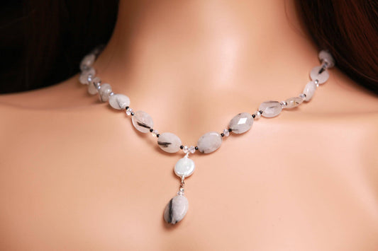 Natural Rutilated Quartz faceted oval black spinel spacer Freshwater coin petal pendant Necklace.