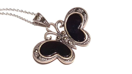 Markasit 925 Sterling Silber Schwarzer Onyx Schmetterling Anhänger Halskette mit Rhodium Anlaufgeschützter Sterling Silber Kette 21x32mm Vintage, Antik